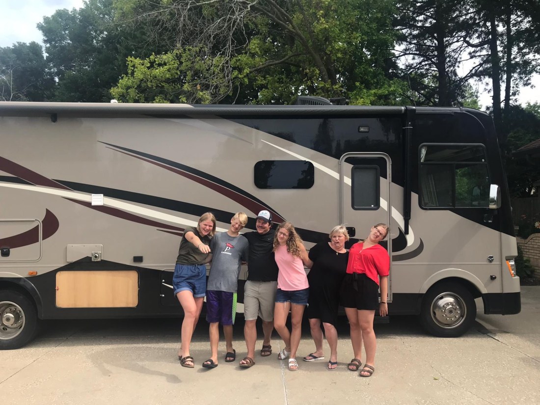 Week two was a bit easier than week one. We were now learning that RV camping is much more fun when you can enjoy the area, and stay in one spot for more than one night at a time. We actually relaxed, swam, boated, hammocked, visited and ate good American cooking before leaving Wisconsin early in week three. We headed for Des Moines, IA, where we would meet friends for two days and have the luxury of actual beds and bathrooms inside the house. I knew they would be thrilled to see us pull up in a 35 foot long RV with a plywood door!