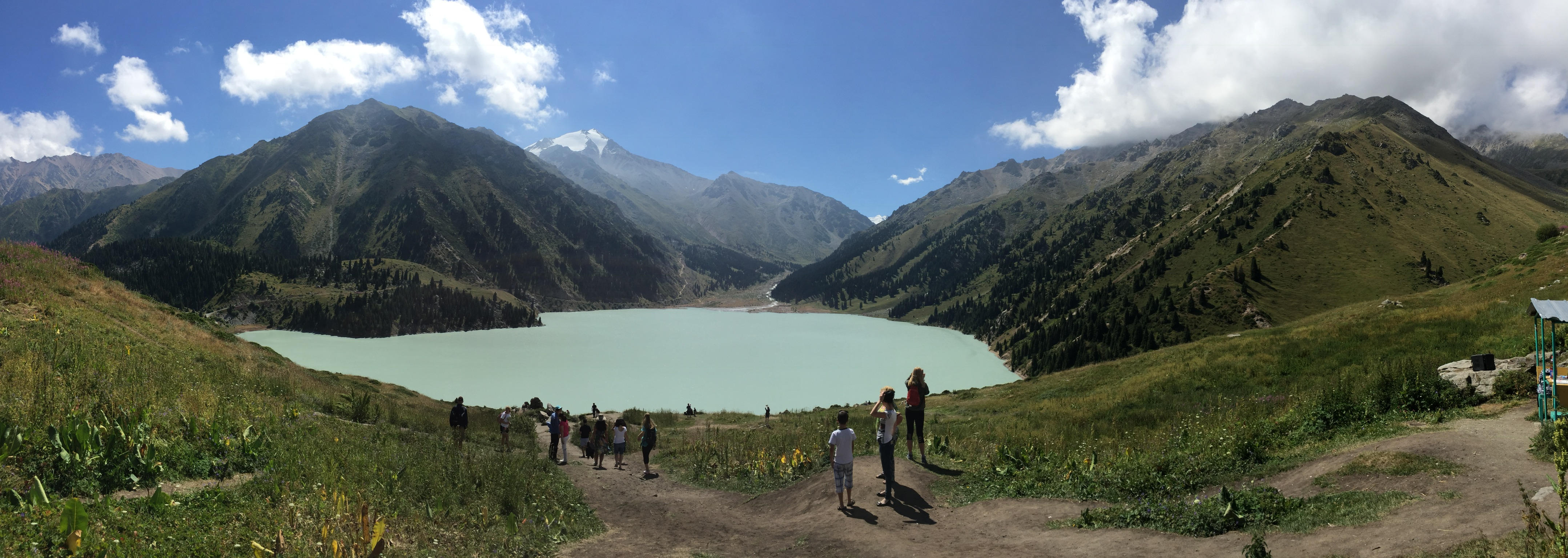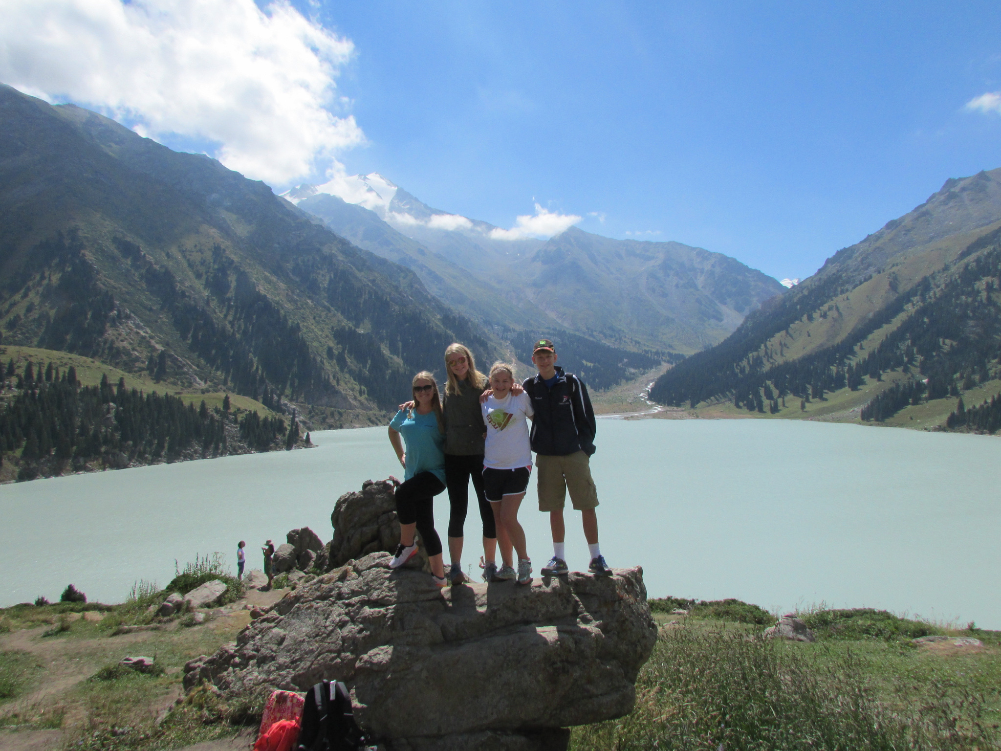 The Ritz is a 30-story building, at the base of the Tian-Shen mountain range. The mountains reach up to 17,000 feet, with many 16,000-ft peaks. They are STUNNING. We were amazed after landing to discover they were snow-topped, even though it was 97F in the city. The hotel is positioned on the top 10 floors of the building, so the lobby is on the 30th floor (rooms are 20-27). I will never forget walking into the lounge/breakfast room and seeing the panorama of the Tian Shen mountains….WOW! Of course the rooms and hotel were great, the food was outstanding, but the view captured us. This was KAZAKHSTAN….!?! To that point, we had only known the flat, open steppe of northern Kz. Fortunately, the hotel had english-speaking guides to recommend, so we took a day trip up into the mountains. After about an hour drive, we stopped at one of the most beautiful sights any of us will ever see….Big Almaty Lake. At 8200+ feet, this mountain lake is crystal clear. Reflecting the clear blue sky, and surrounded by peaks well past 13,000 feet, all 6 of us were speechless (a real challenge). Michael’s first reaction was, “I’m going to live here when I grow up. I could stay here my whole life.” Wow! That’s a ‘Legit’ compliment coming from a 15-year old boy! I was thrilled to have found something we equally adored.